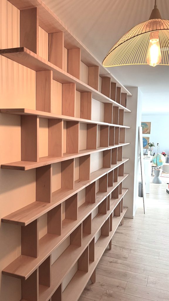 Avec ses montants asymétriques, la bibliothèque Harmonie se distingue par un design original qui lui donne du caractère. Bien plus qu’un simple meuble de rangement, elle devient un élément décoratif à part entière, capable de structurer l’espace avec élégance.